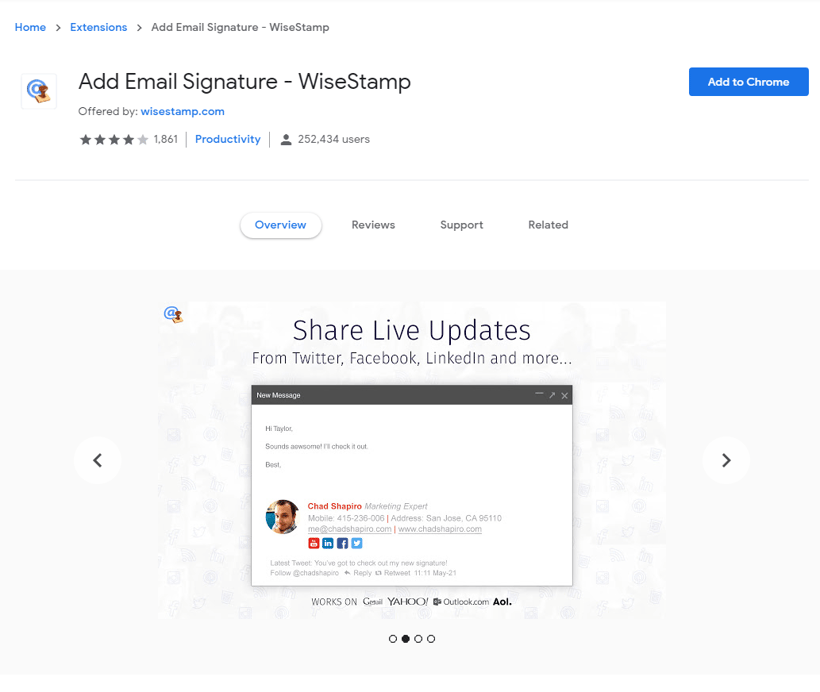 WiseStamp helps create professional email signatures with social links, promotional banners, and branding.