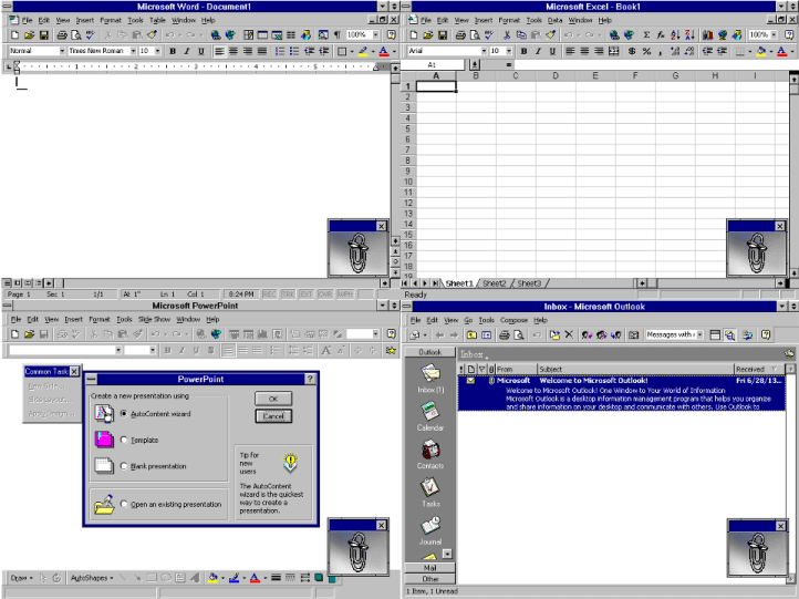Enter Office 97, an improved version of Office from a year prior. It made the Internet the focus of all if its improvements. As Bill Gates stated in a press release about Office 97, “Office 97 marks a great step forward in productivity applications, bringing to business users the benefits of the Internet plus the results of our ongoing research in areas such as natural language processing, user-interface design and software componentization.”