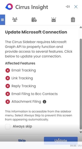 - Manifest Version 2025.6.10 or newer → no update required, restart Outlook, and the Cirrus sidebar will work as expected